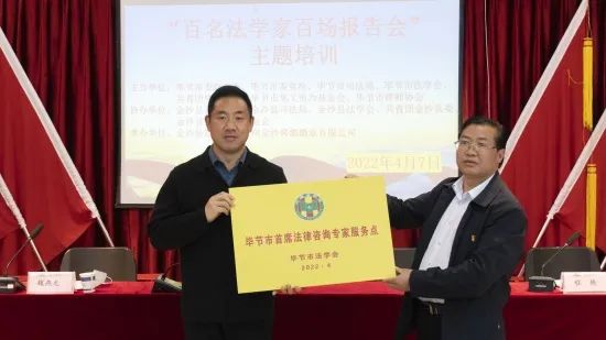 培训在金沙窖酒酒业有限公司三楼会议室举行,培训现场,贵州金沙窖酒酒业有限公司相关负责人致欢迎词,并介绍了公司的发展概况。毕节市法学会授予金沙窖酒酒业有限公司“毕节市首席法律咨询专家服务点”牌。